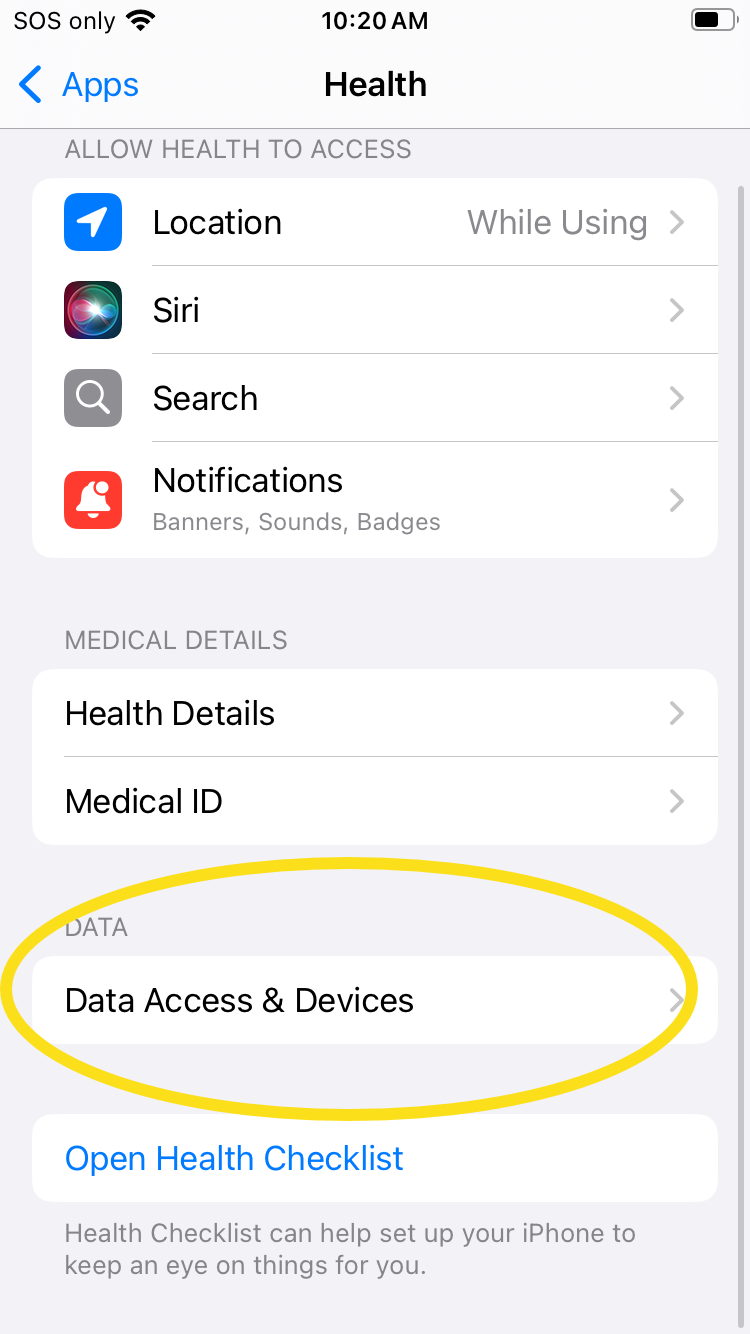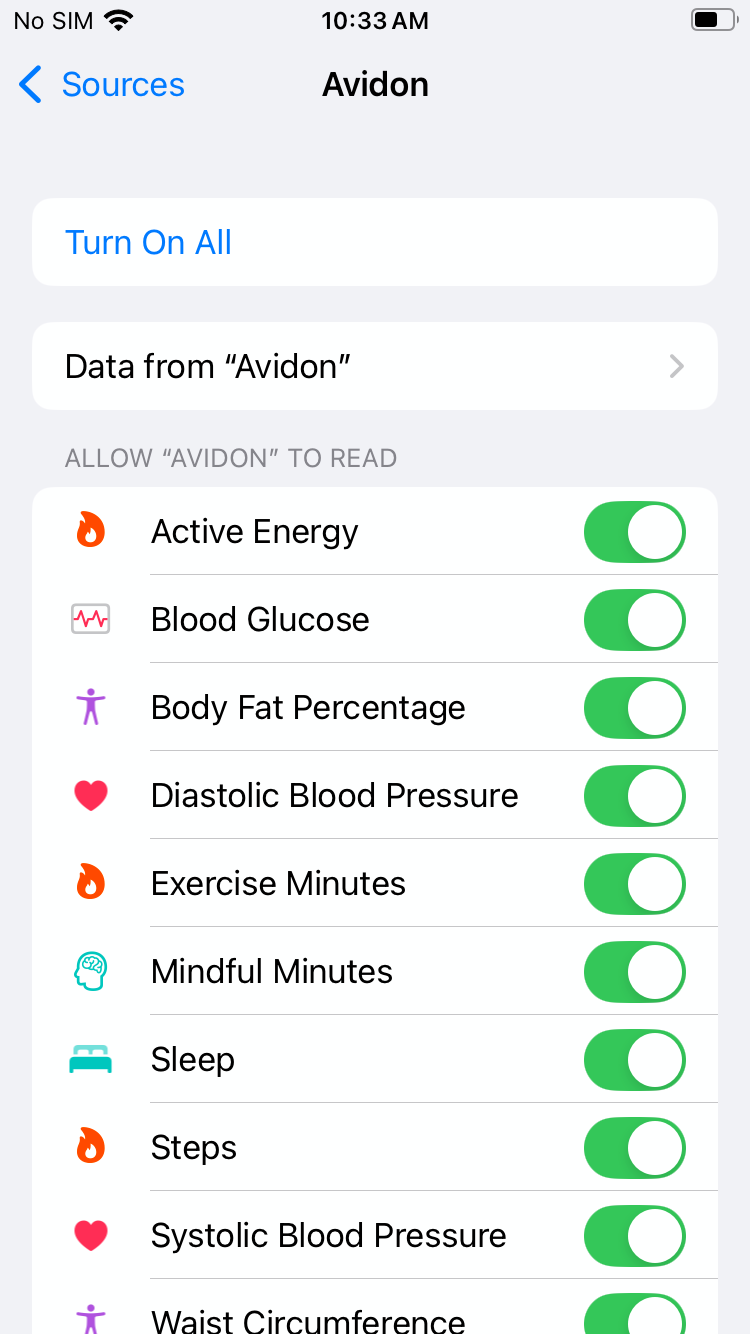 You can also manually enable the sync through iOS (rather than through Avidon's app). To do this, go to Settings, select Apps, then select Health App. On this page, select Data Access & Devices and choose Avidon: