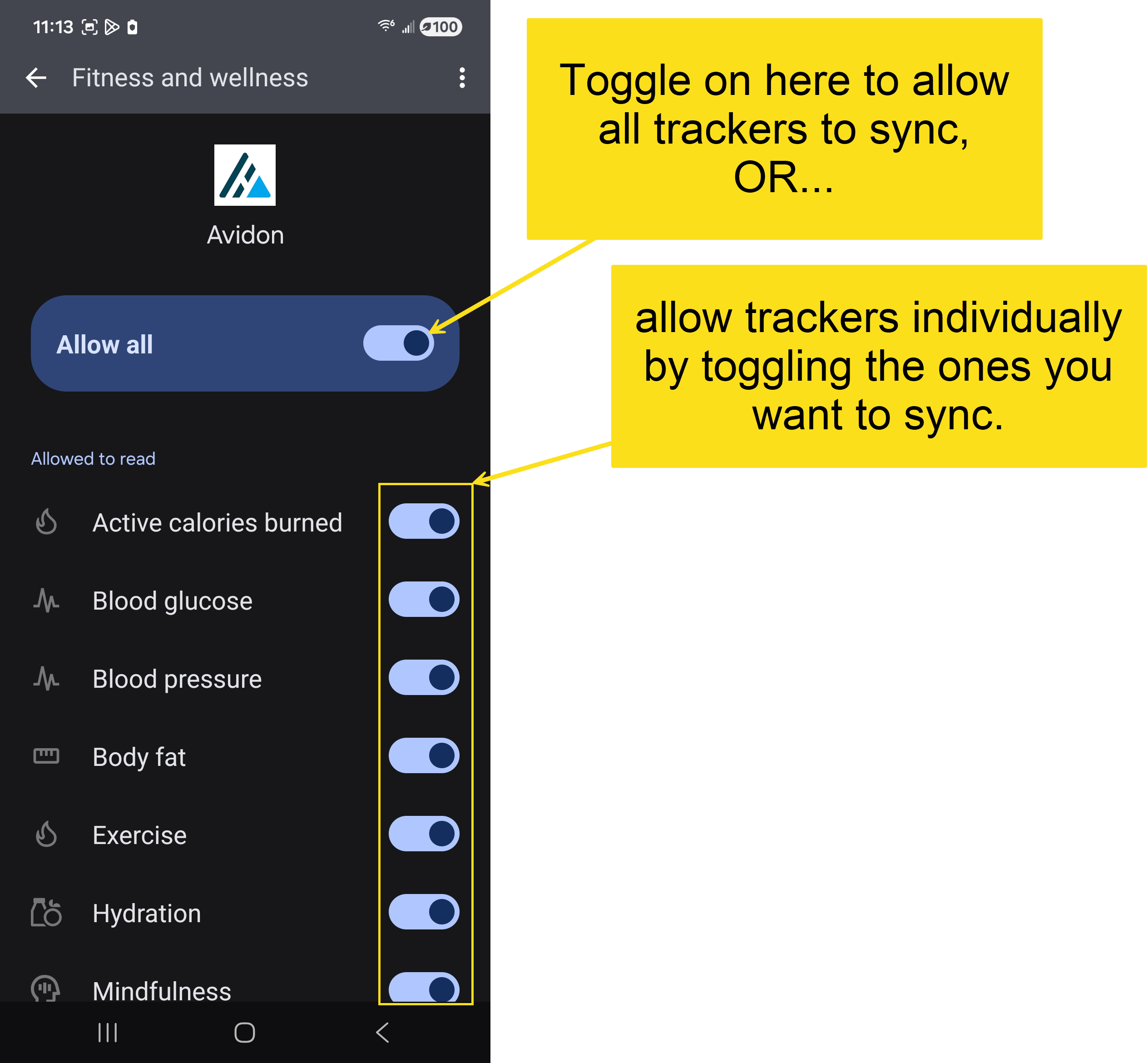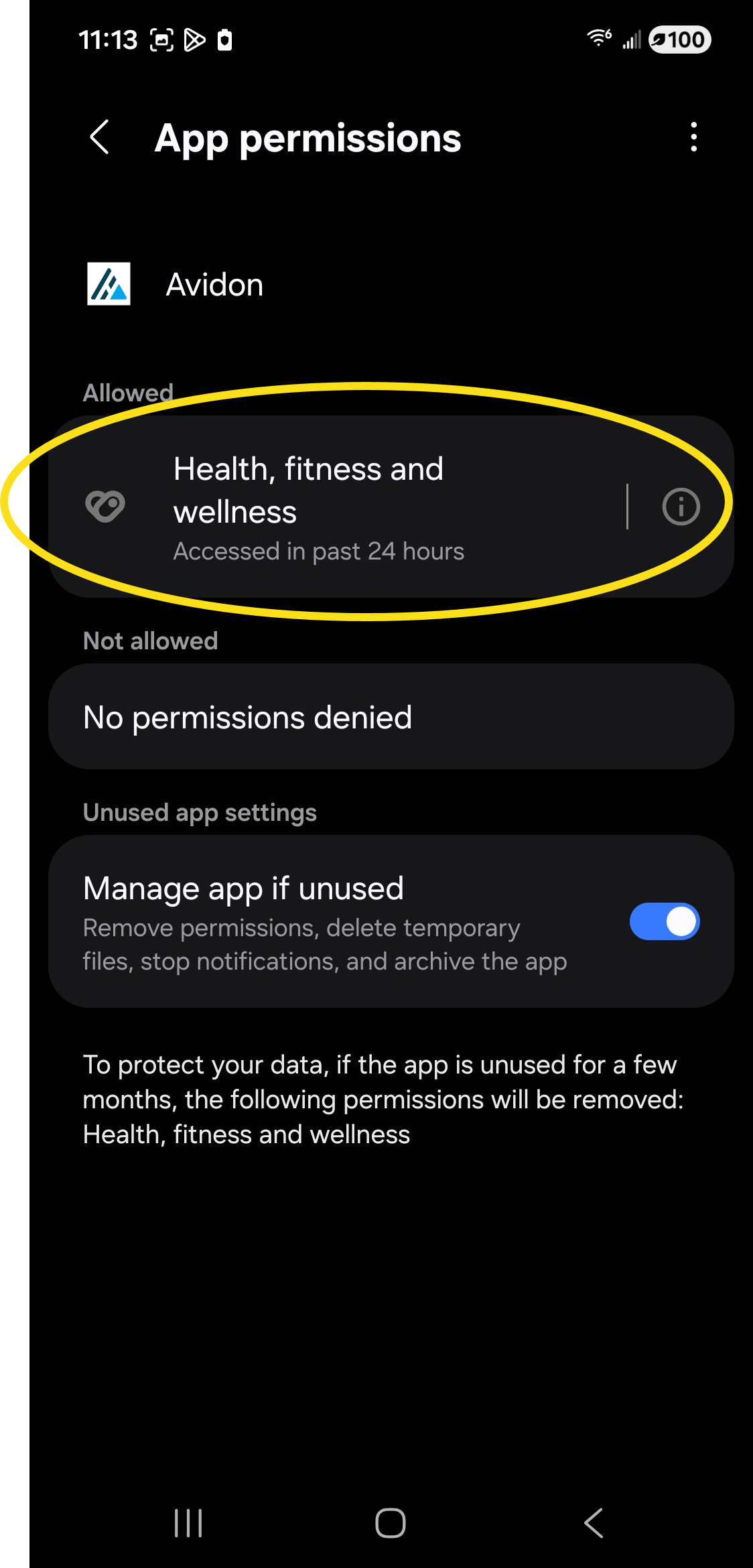 In the Avidon screen, select Permissions, then select Health, fitness, and wellness: