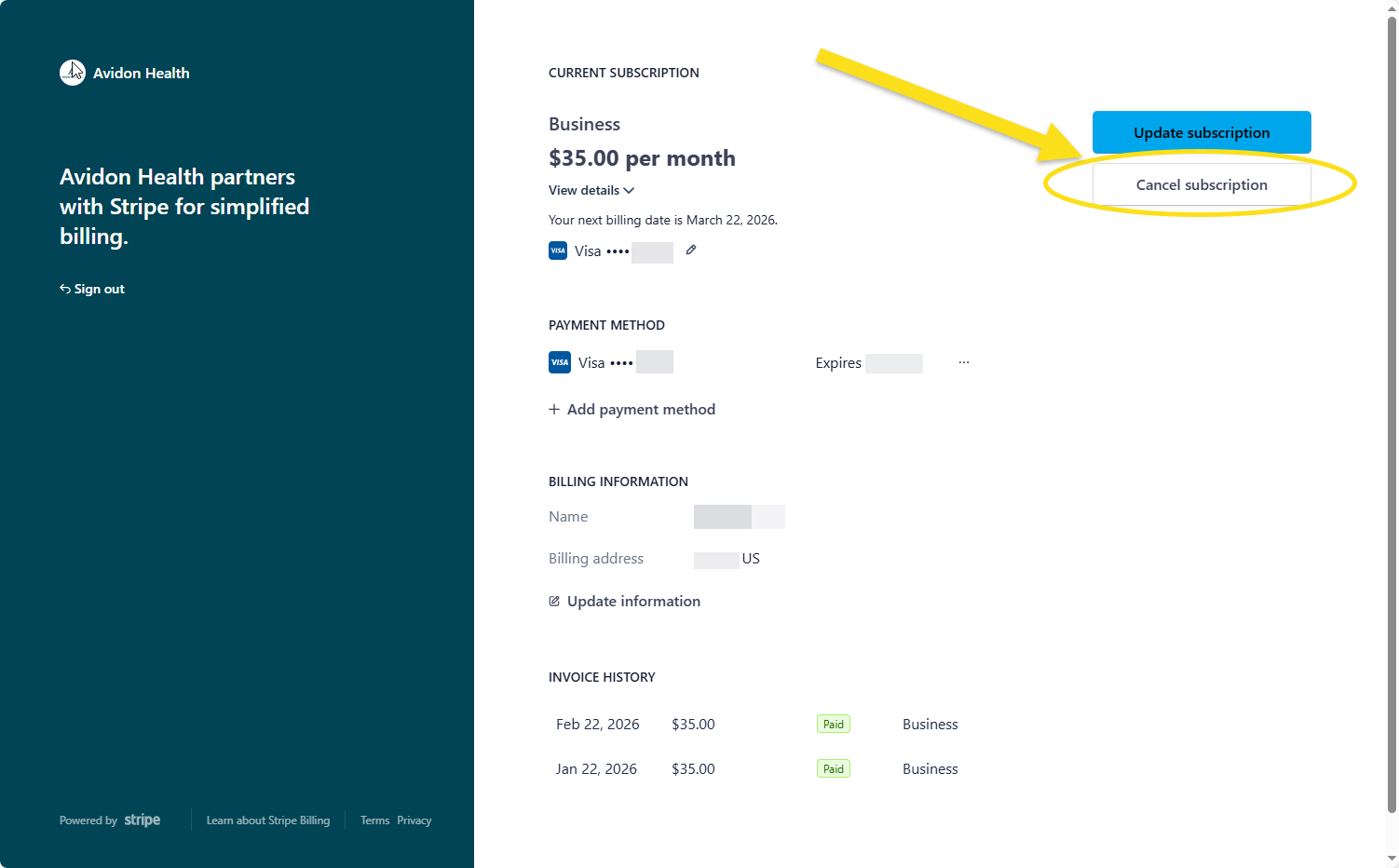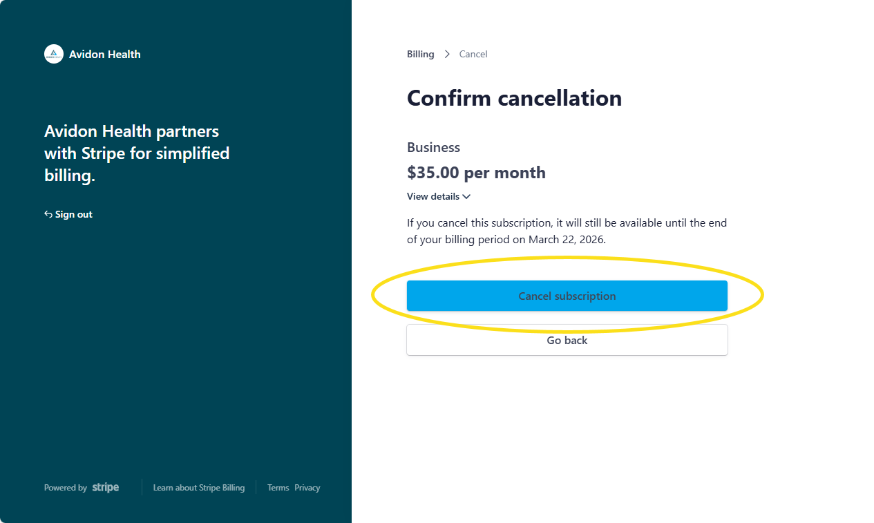 - Cancellation must be completed through the Stripe Billing Portal (not within the Avidon app).