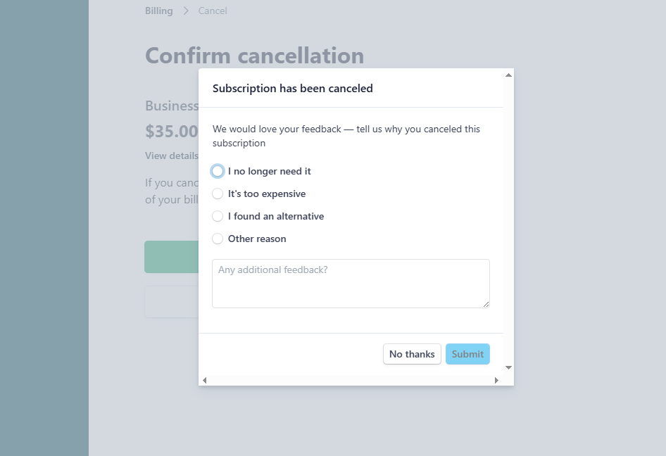 If you want, provide feedback on why you are canceling and submit, or click "No thanks" and complete the cancelation: