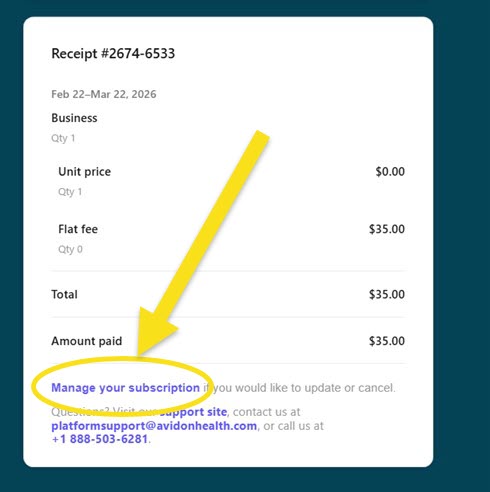 Locate your purchase receipt email from Avidon and click the “Manage your subscription” link in the email: