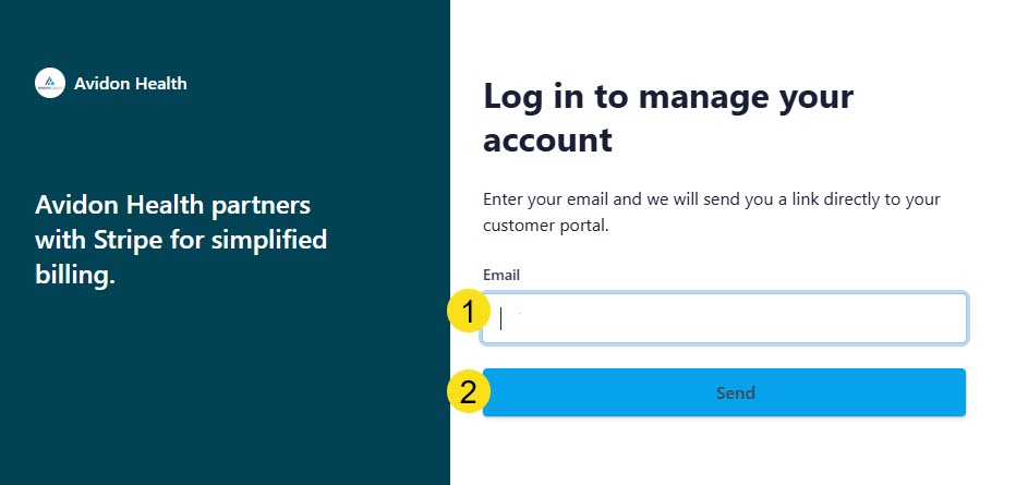 This will direct you to the billing portal where you can enter your email (1), click Send (2), and automatically be delivered to your billing portal: